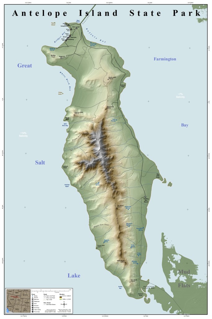 Antelope Island is 15 miles long and 5 miles wide and is located just north of Salt Lake City in Davis County. It’s the largest island on the Great Salt Lake and its highest point is Frary Peak at 6,596 feet. John Fremont and Kit Carson were the first Anglo explorers to survey the island and provided the name after enjoying the abudance of antelope found there. Evidence of Native American habitation has also been identified although details are scant.1